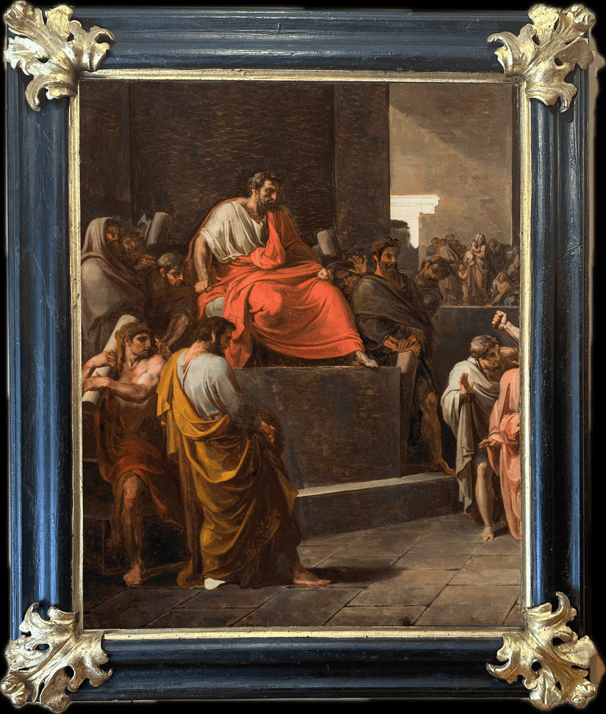 [5] Compared to the painting now kept at the National Museum of Capodimonte, in these two canvases there are numerous differences in style, which testify to the long creative road undertaken by Camuccini towards the final version (See Vincenzo Camuccini (1771-1844). Bozzetti e disegni dallo studio dell’artista, edited by G. Piantoni De Angelis, exhibition catalogue, Rome 1978, pp. 34-37, nos. 65-69). In the preparatory study for Appius Claudius, for example, the most evident difference concerns the figure of the lictor positioned to the left of the Roman politician, caught in the act of covering his face with his left hand to avoid watching the tragedy unfolding before him. An expedient which, in the final work, Camuccini decided to change, giving the figure a more serene expression and admiration of Appius Claudius.