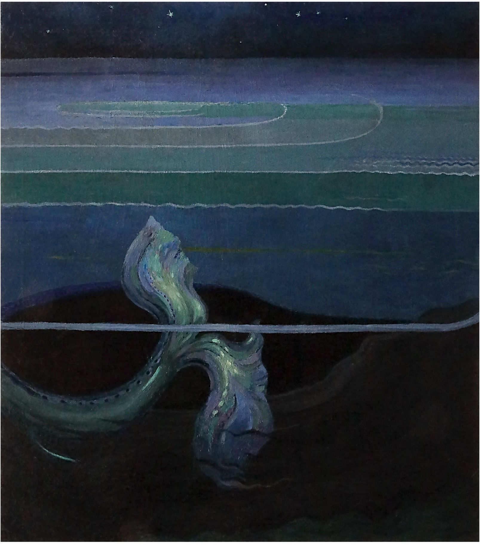 Two years later, in 1924, a work presented under the title Silenzio (Sirena) – Silence (Mermaid), would be exhibited in Milan at the Bottega di Poesia, a title which effectively renders the idea of silence evoked by the prone tail of the mermaid in the calm night sea. This may therefore have been the painting on canvas, or even the first idea on paper with the whole figure of the mermaid.