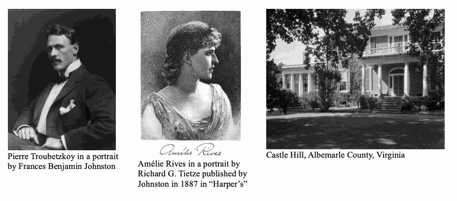 In the summer of 1896, probably through Oscar Wilde, Troubetzkoy made the acquaintance of the brilliant American writer Amélie Rives Chanler, author of the scandalous novel The Quick or the Dead?,8 and at the time married to the American millionaire John Armstrong “Archie” Chanler. The charm of the prince – the photos and testimonies of the time reveal a tall, strapping, good-looking man, “physically something of a giant”,9 with a “charming personality”10 and who combined “[...] the physical appeal of the ‘savage Tartar’ with the romance of his Old World Italian accent and villa”11 – led in the short span of a few weeks to the divorce of the writer from Chanler and, after only four months, Pierre and Amélie were off to the United States to get married in the writer’s paternal home in Castle Hill (Virginia).